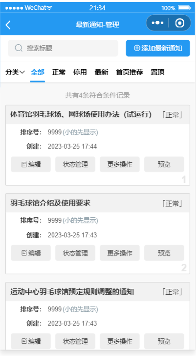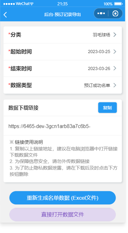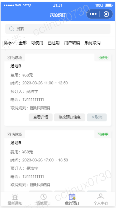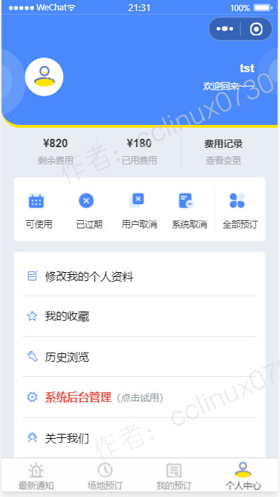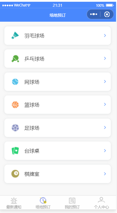 面向各类公共体育场所,校园对外开放体育设施,社区健身设施等,提供场所管理、场所统计、场所可预订时段与价格管理,费用计算、扣费记录、预订登记(支持连选多个时段),用户可以实时查看自己的费用余额,费用消耗情况,费用使用记录。后台也可以随时增减用户的账户金额。 本系统前后端完整,包括最新通知,场地预约,单选或者多选预订时段,后台管理,用户管理,待注册用户录入,用户金额数后台增减,预订名单管理,预订记录管理与导出,我的预订,历史浏览,我的收藏等模块,采用腾讯提供的小程序云开发解决方案,无须服务器和域名。