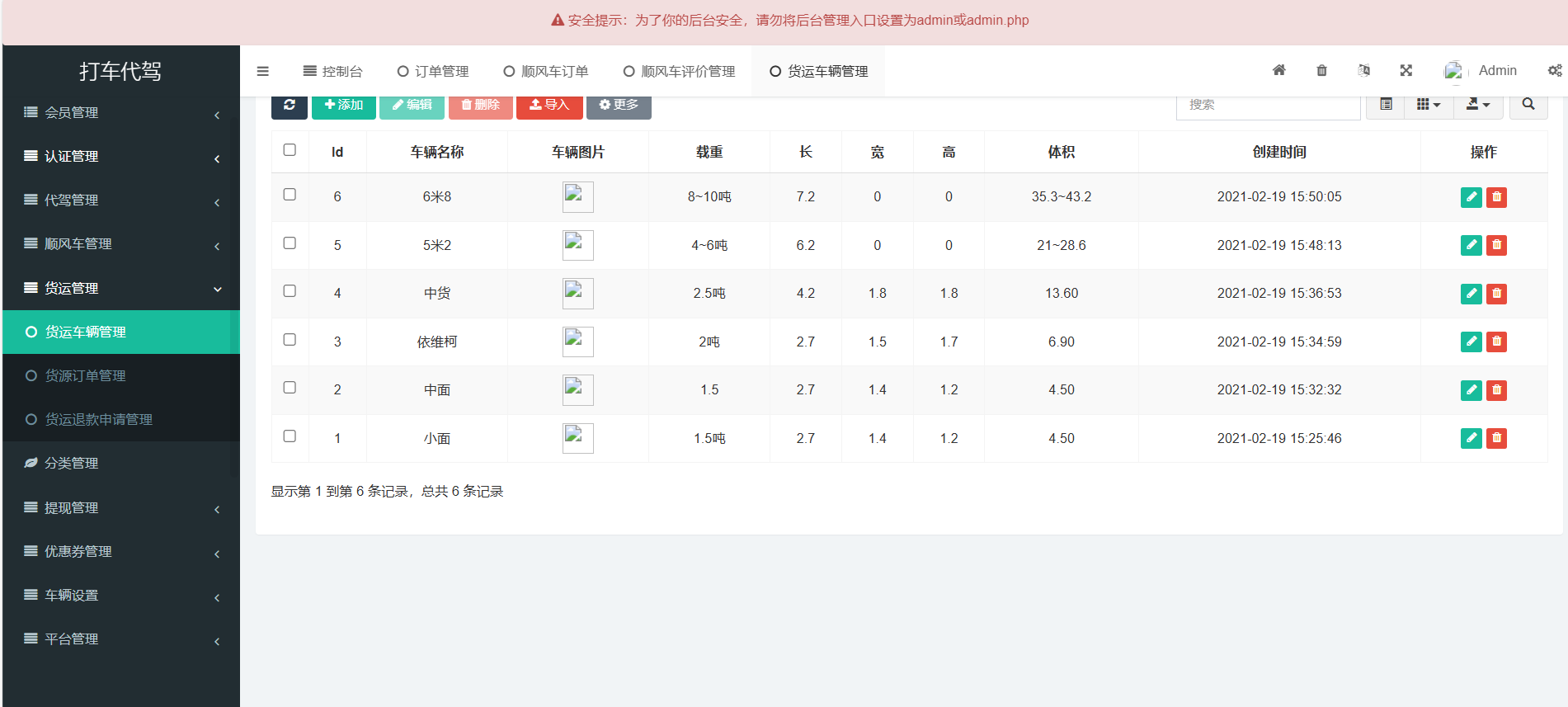 - 货运管理:货运车辆管理和货运订单管理。