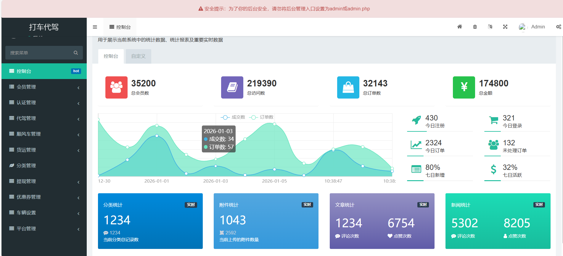 - 代驾管理:订单管理、轮播图管理、话题列表和话题评论管理。