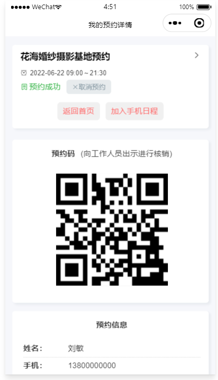 拍摄预约凭证:支持线下到场后校验签到/核销/二维码自助签到等多种方式