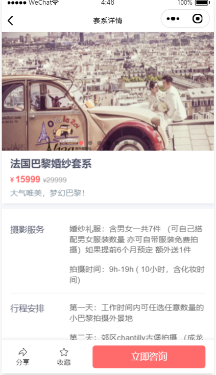 通过小程序,告诉用户照相馆的信息,所在位置,联系方式等。并且,小程序提供了预约功能,用户可以随时通过小程序预约服务时间,订单功能可以给予用户查看自己的订单情况,甚至,我们可以在里面选择拍照的风格,筛选合适的时间、摄影师等等,非常方便照相馆与用户之间的信息交流
