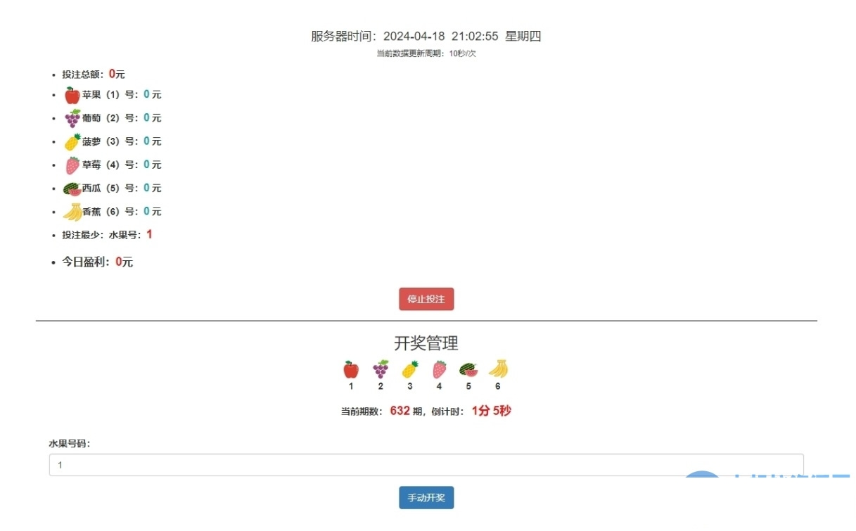 水果开奖游戏是一款基于ThinkPHP3.2.3框架开发的水果竞猜游戏源码,无需任何开奖器采集,直接可在后台设置手动开奖或者定时开奖,支持代理功能