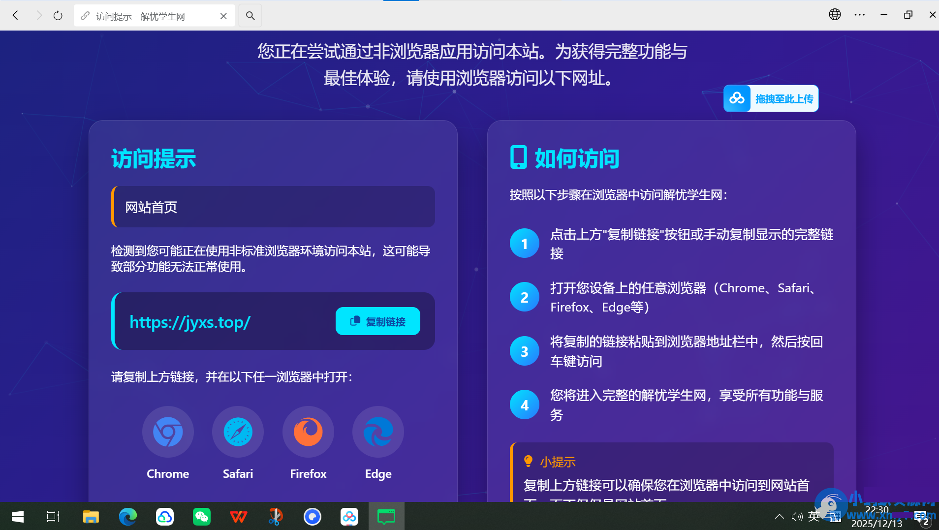 采用动态拦截技术,获取拦截前用户访问的网址,并且传参到拦截页面,可以做到用户通过什么子链接访问网站,只要是微信QQ访问,均会重定向到拦截网页,并显示复制链接到浏览器打开访问,且复制的链接采用动态获取拦截前用户访问的原网址,该拦截代码为解忧学生网亲测原创现在公开给大家学习使用。下面是测试图片。开箱即用。附带教程